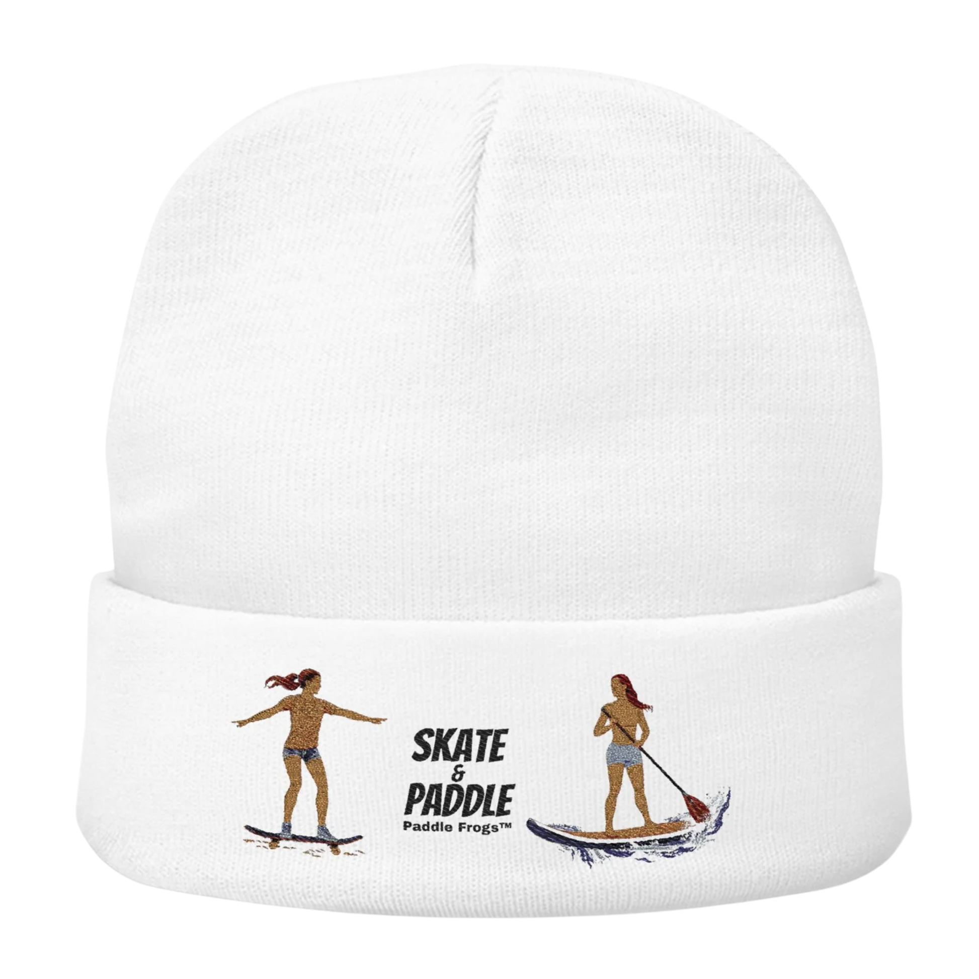 More than just a beanie, this is a soft-spun tapestry of the Paddle Frogs™ philosophy—a quiet nod to the rhythm that connects the world on wheels to the world on waves. The white and grey knit is a canvas for an emblem of duality: a fearless skater girl grounded on the gritty pavement, mirrored by a serene paddle boarder gliding over the spray. This hat is for the soul that finds its peace in motion, proving that Life in Balance isn't about standing still—it's about mastering the shift between two worlds.